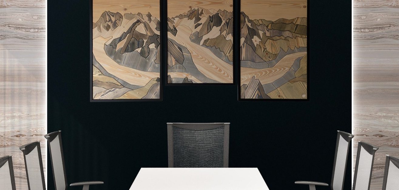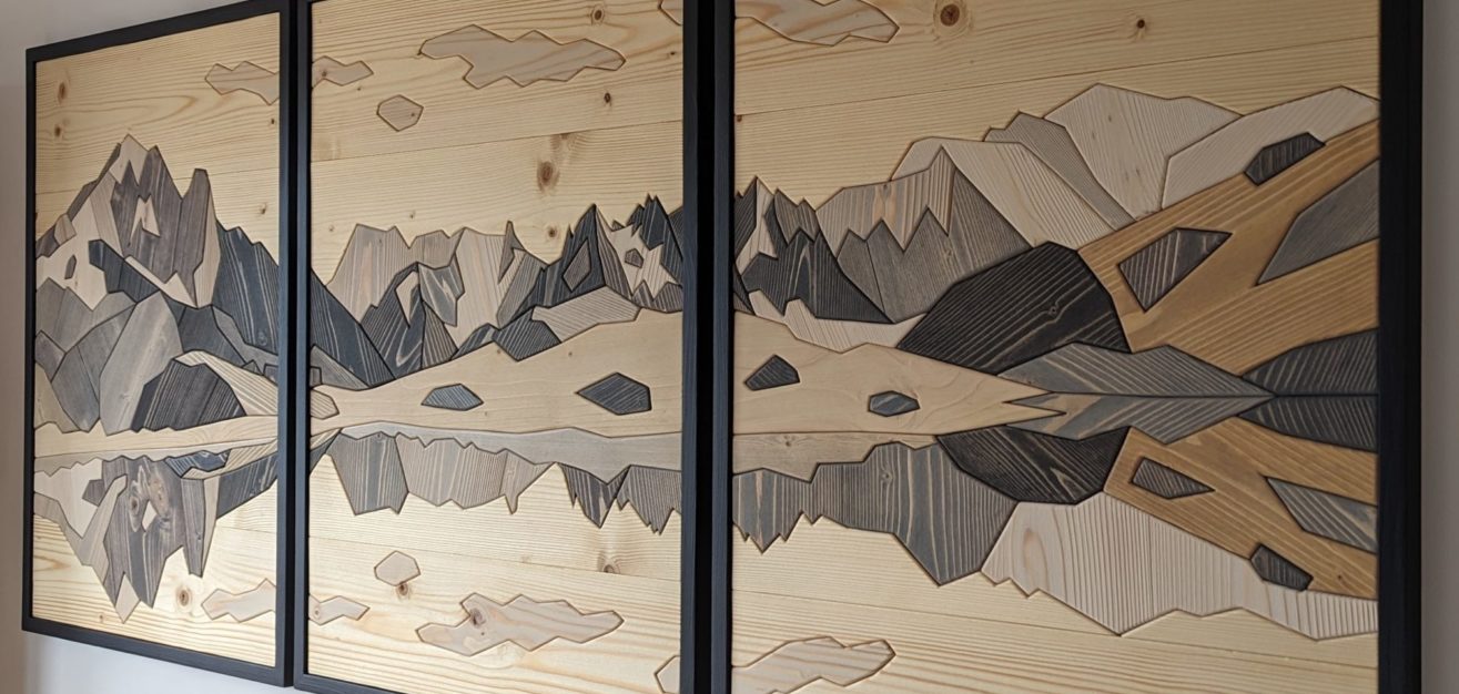 Fabrication de tableaux de montagne en marqueterie de bois .