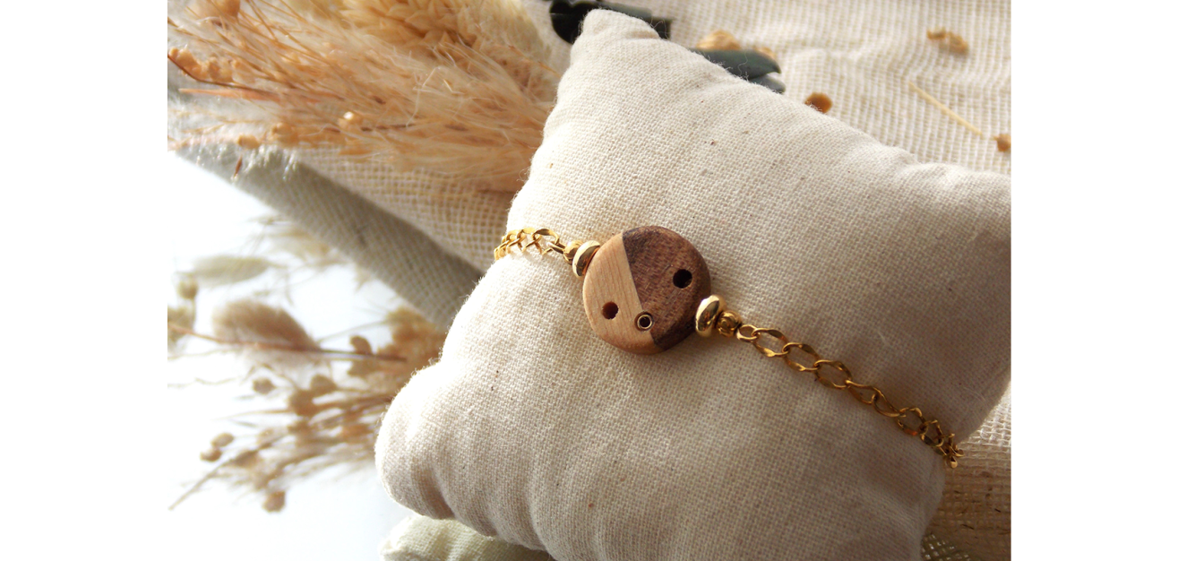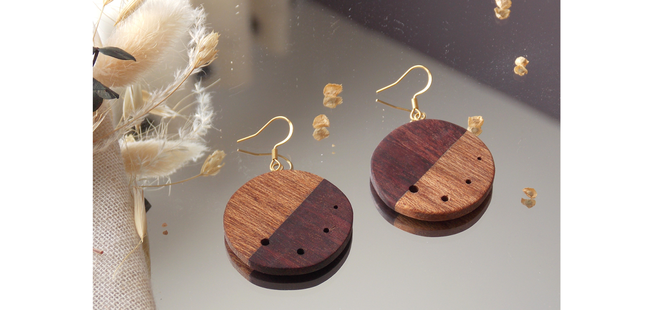 Les bijoux de l’atelier, c’est le réemploi de chute de bois récoltées en menuiserie.